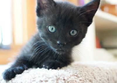 Fez and Cap are adorable 3 month old black cats and Fedora is a precious 3 month old brown tabby. They will love attention and cuddling you. Fedora is very food motivated and would do great learning tricks. He will love to cuddle and will purr on your chest. Fez and Cap are sweethearts that will love to be with you. Fez, Fedora, and Cap would do great in a home with another cat or adopted as a pair so they have a playmate.