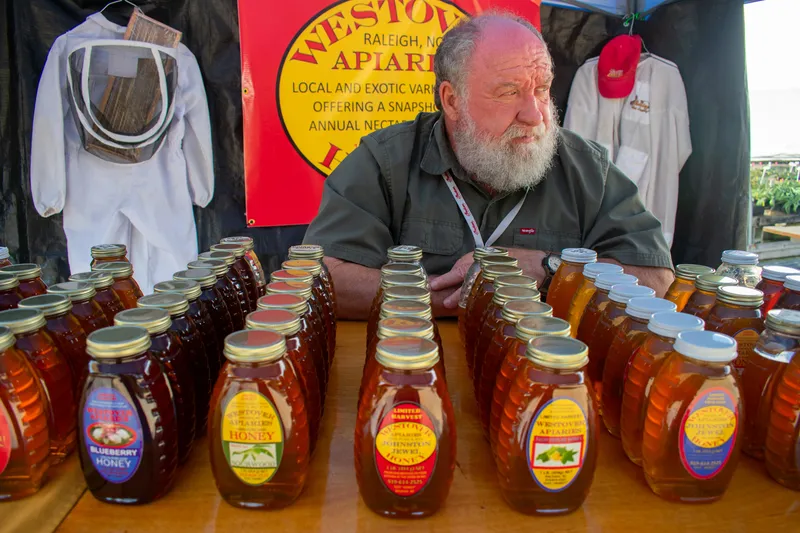 Crump sells his honey eight times a year at Plant Delights Nursery in Wake County. He owns Westover Apiaries and sells more than 16 different types of honey depending on the season. The types of honey produced depend on flowers’ nectar, which affects both taste and color. Photo by Ellie Kollme.
