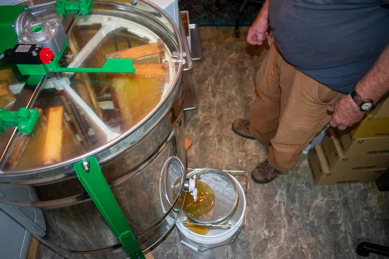 Crump recovers the honey from the extractor. As it spins, honey flows out of the bottom and is collected in a bucket. Once the honey is produced, Crump uses a honey-filling machine to bottle the honey. Photo by Ellie Kollme.
