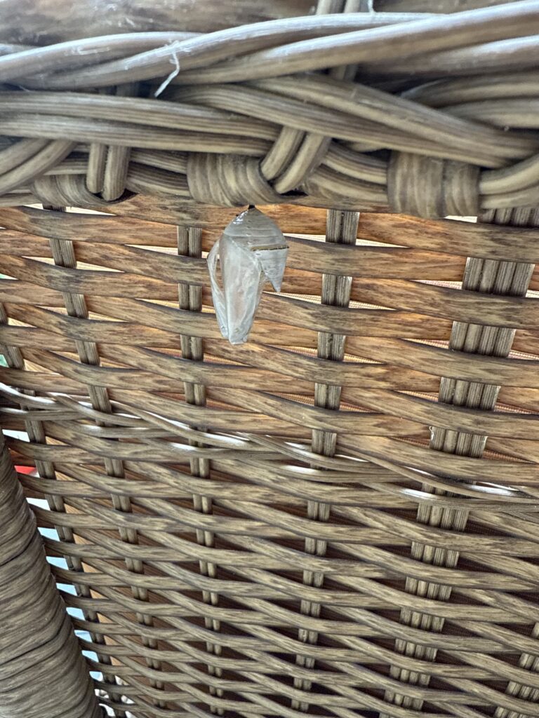 Day 73: We come home to find a chrysalis suspended from the back of the loveseat in the yard, in a perfect viewing position from our kitchen window. I wonder if the fairies had something to do with it.