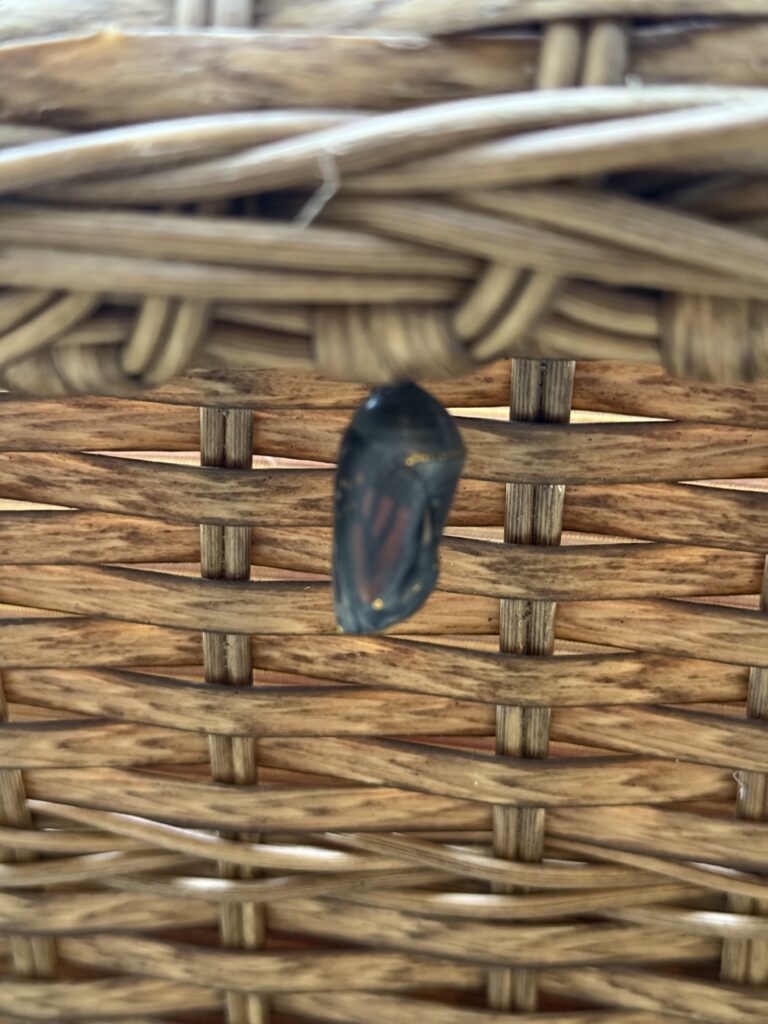 Day 72: The backdoor bangs against the wall! She has found a chrysalis! What’s more, we find other fat caterpillars climbing the fence in search of the perfect spot. Others are hanging upside down from leaves in the shape of an “L” or a backwards “J.” I think of the words Love and Joy.