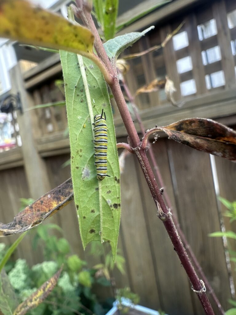 Day 62: She bursts into the kitchen from the backyard, slamming the door against the wall, like I asked her not to do at least 62 times over the summer. But her excitement is unrestrained: “I found a caterpillar!” Ginny and I exchange a look: Could it really be true? Sure enough, a little yellow-and-black-striped guy is quietly munching his way up one of the last remaining milkweed leaves.