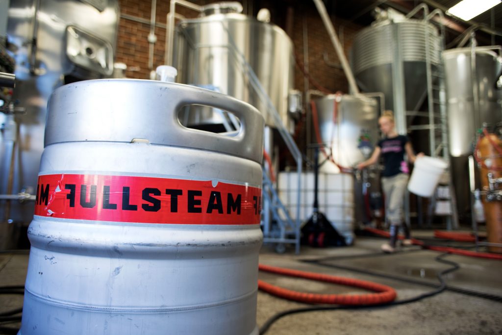 Fullsteam Brewery sits on the outskirts of downtown Durham in a low, beige-brick building with enormous red hangar doors.
