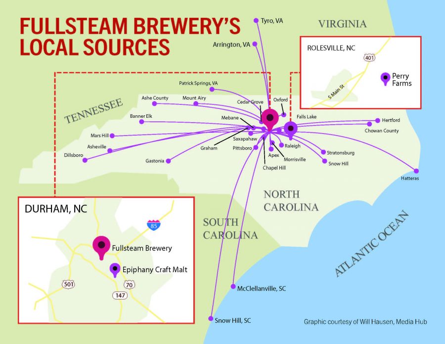 Fullsteam’s business model emphasizes what it refers to as the “Southern beer economy.” While many breweries use ingredients from across the country and the world, Fullsteam buys from 49 different businesses in the state. Its supply chain — from farmer to consumer — emphasizes North Carolina and southern agriculture.