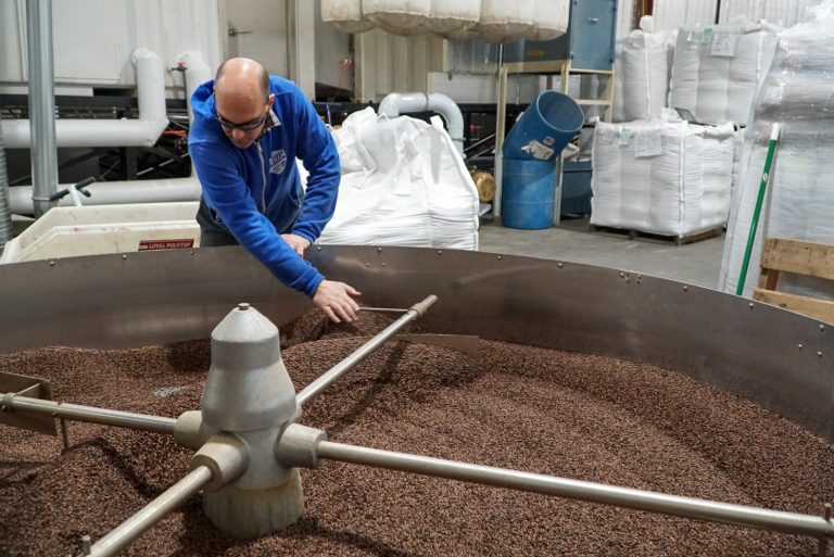Sebastian Wolfrum, owner and head maltster at Epiphany Craft Malt, inspects roasted barley seeds as they cool. Wolfrum sells malt, a key ingredient in beer, to breweries like Fullsteam. (Photo courtesy of Sebastian Wolfrum, Epiphany Craft Malt)
