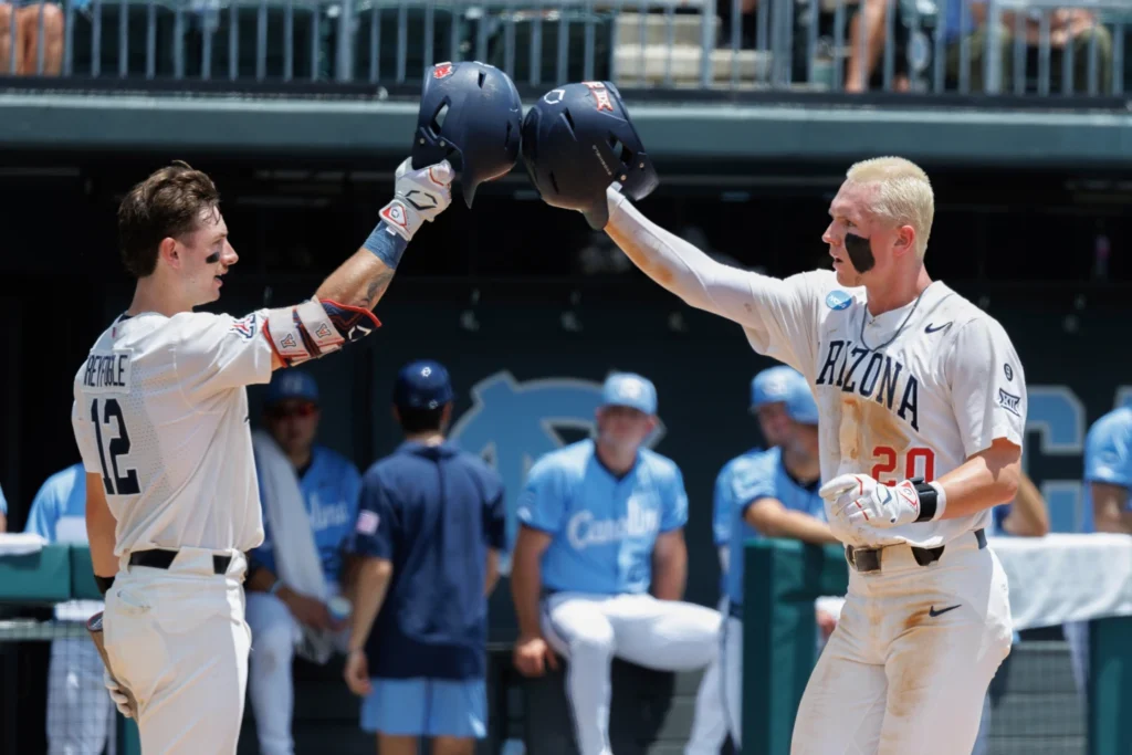 Arizona’s Tommy Splaine (20) celebrates with Easton Breyfogle (12) after scoring a run during an NCAA super regional college baseball game against North Carolina, Saturday, June 7, 2025, in Chapel Hill (AP Photo/Ben McKeown)