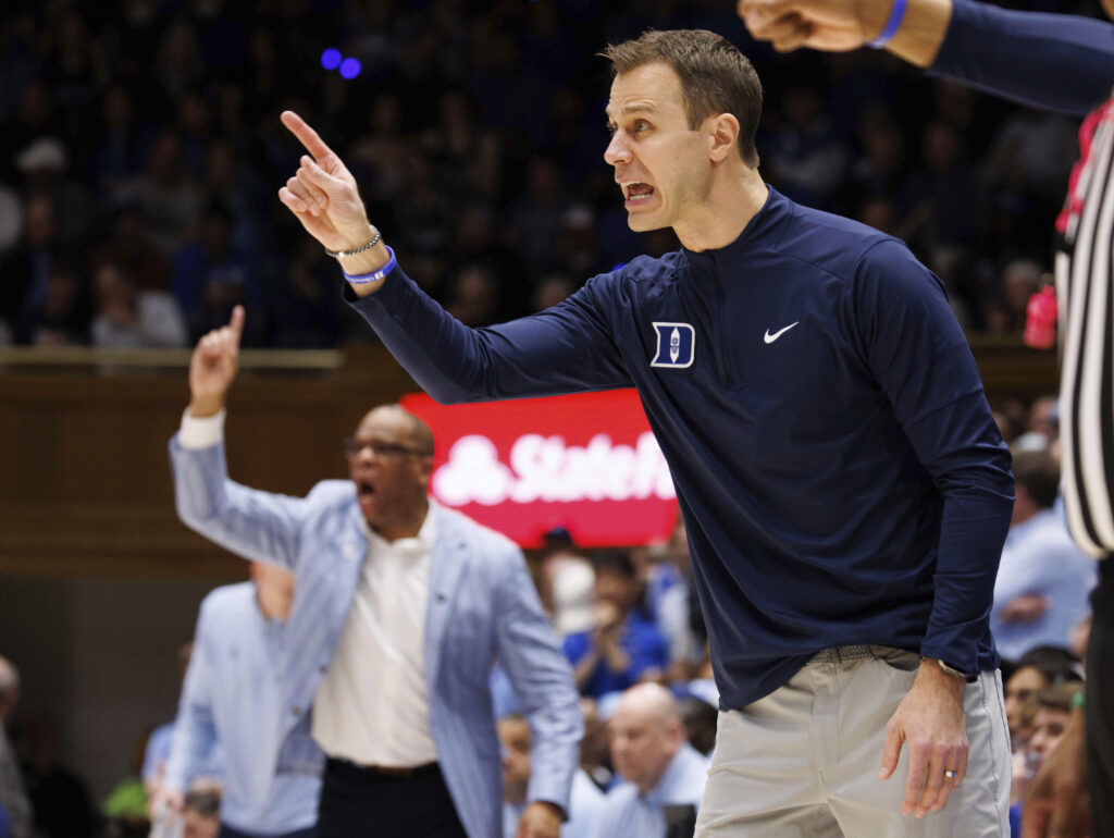 Duke head coach Jon Scheyer directs his team during the first half of an NCAA college basketball game against North Carolina in Durham, N.C., Saturday, Feb. 1, 2025. (AP Photo/Ben McKeown)