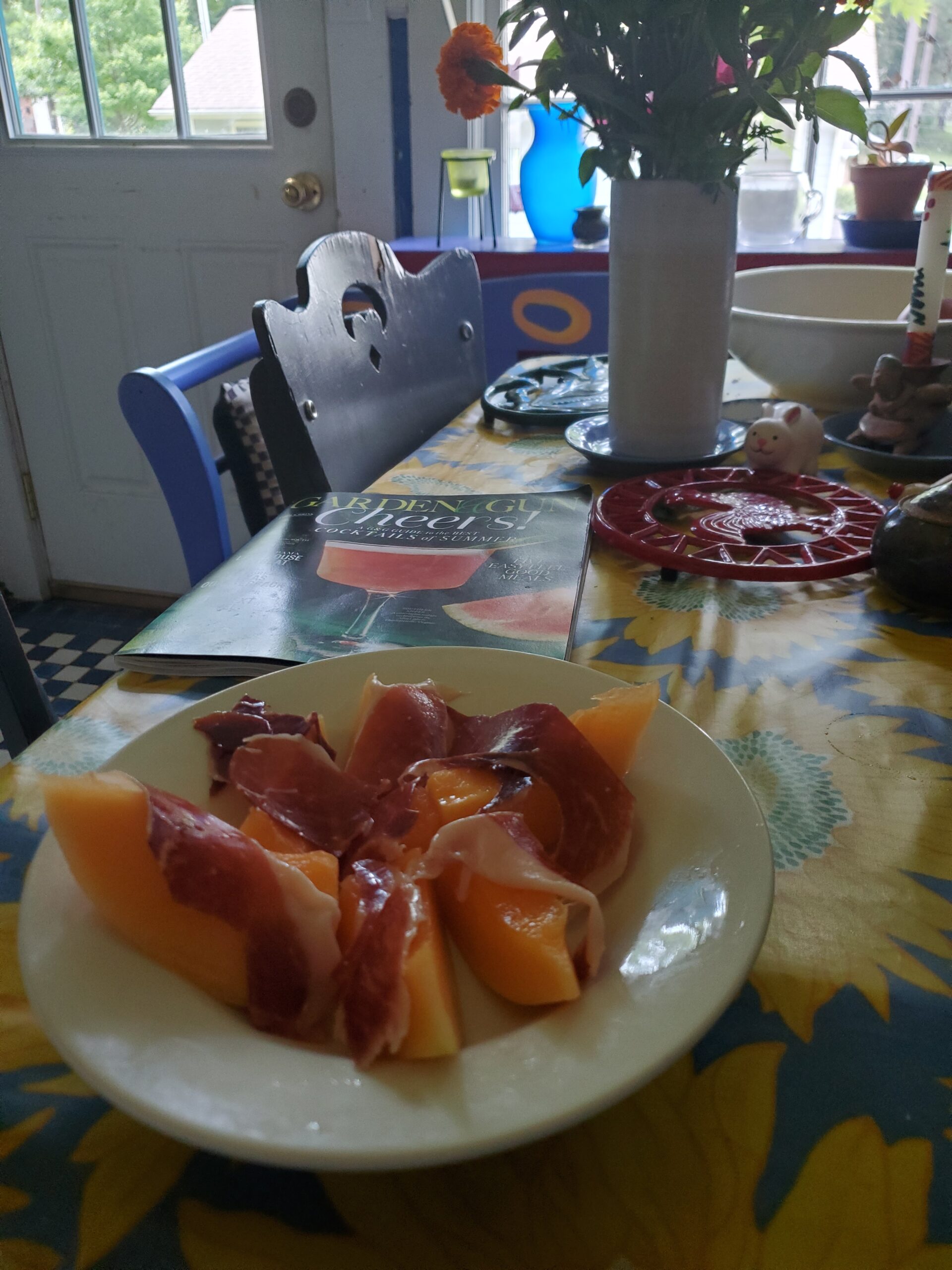 I think that I have mentioned before the summer custom from my childhood known as eating out of the garden. Of course, if you have a garden, you can do this all season – but, to me, this term refers specifically to a whole meal gleaned just outside of the kitchen door, probably in July. Since my yard doesn’t have any sun, my garden is the Carrboro Farmers Market. I’ve entered a spell of corn on the cob, sliced tomatoes, cucumbers and onions and squash and onions at least once a week. And tomato sandwiches are an almost instant lunch with nothing to clean up except a plate and a knife. And finally, both Sam Suchoff at The Pig and Eliza MacLean at Cane Creek Farm are producing the most delectable serrano hams to drape over the fresh melon or figs found at nearby stalls.