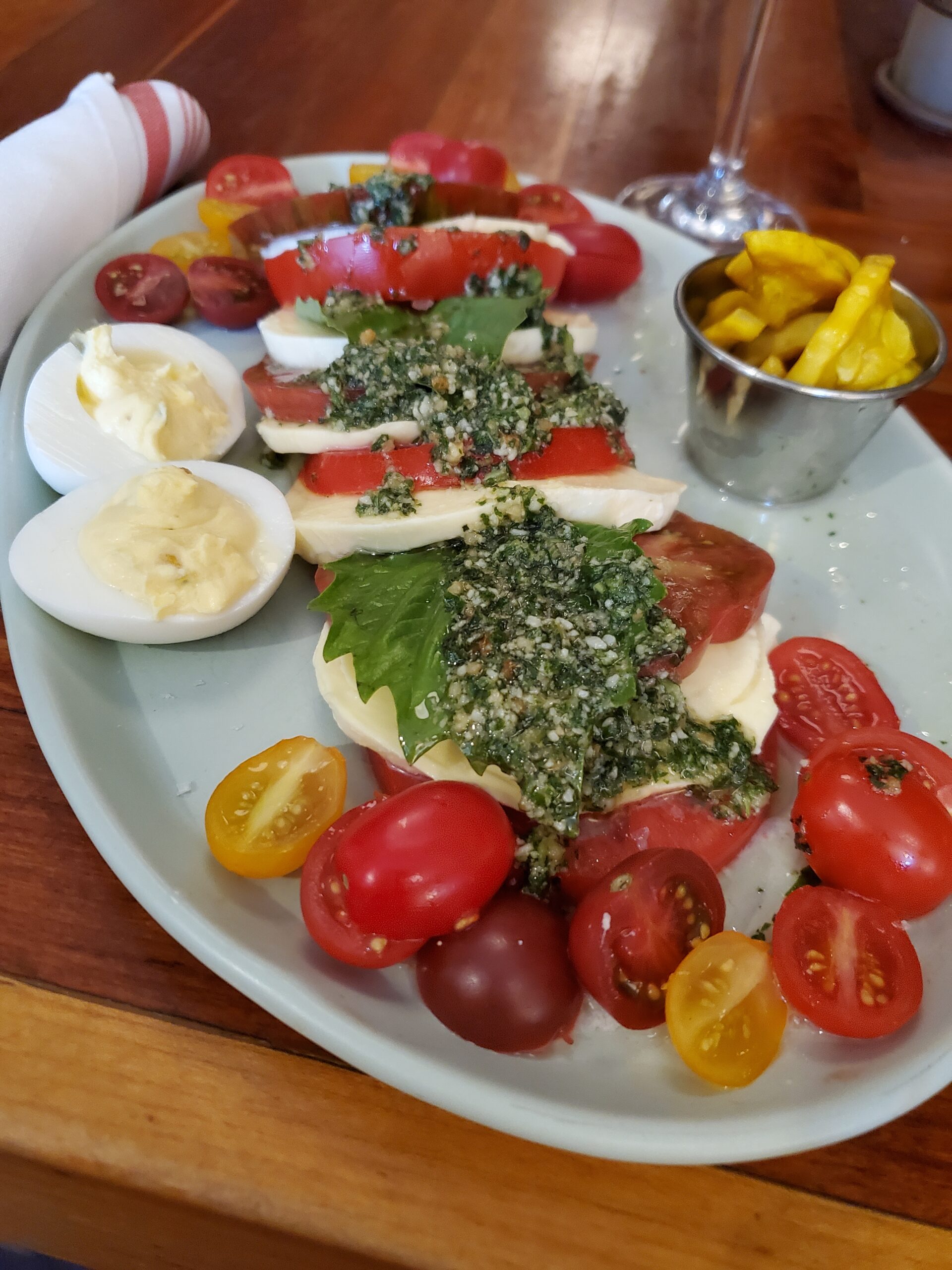 So, on that uncertain note, let’s look at what’s going on around town now. I’ve enjoyed a series of dinner dates with old friends, most of whom I hadn’t laid eyes on since before the lockdown, so I’ve been grazing all over the place. Glasshalfull in Carrboro had a nice soft opening party mid-month. It was a wonderful evening with good food, a room full of familiar faces and a delicious daiquiri. Lantern has resumed using real plates and glasses at their outdoor pop ups. A lot of old favorites like the Bento Box and Salt and Pepper Shrimp are back. I had my first visit to Osteria Georgi on Elliott Road. It’s pretty and lively. The staff and the food are top notch. I got to meet Chef Dan Jackson for the first time. I dashed into Acme one evening for an absolutely enormous tomato plate during their 20th annual tomato festival. I ate every bite of course. As reported last month, Imbibe is serving a limited in-house menu at their upstairs bar but now, live jazz has resumed on Mondays!