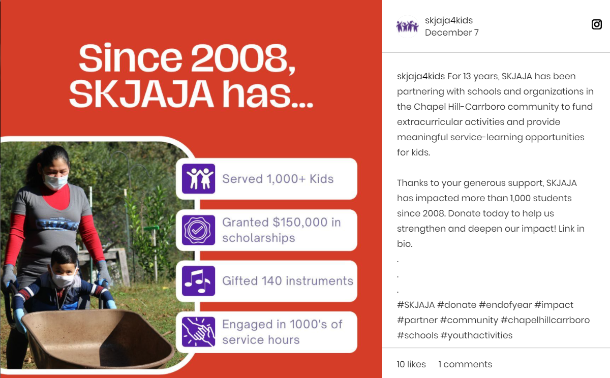 Kalafatas is a graduate of UNC-Chapel Hill, and her years of nonprofit experience include time in Boston and Harvard, leading efforts to serve kids and their families through music and art. In coming home to North Carolina, Kalafatas looks forward to continuing that service in a new organization, and new community, as part of SKJAJA.