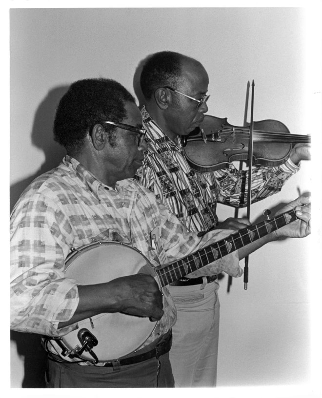 An updated photo of Odell Thompson (left, banjo) and his brother Joe (right, fiddle) provided by the Orange County Arts Commission.