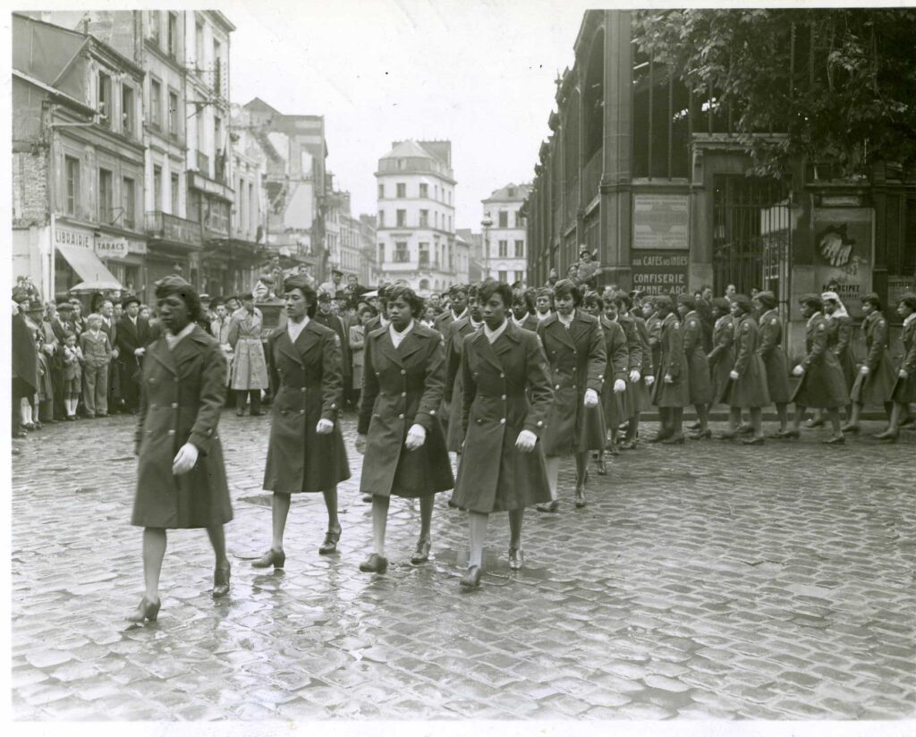 Members of the 6888th Central Postal Directory Battalion in a May 1945 parade honoring Joan of Arc where she had been burned at the stake