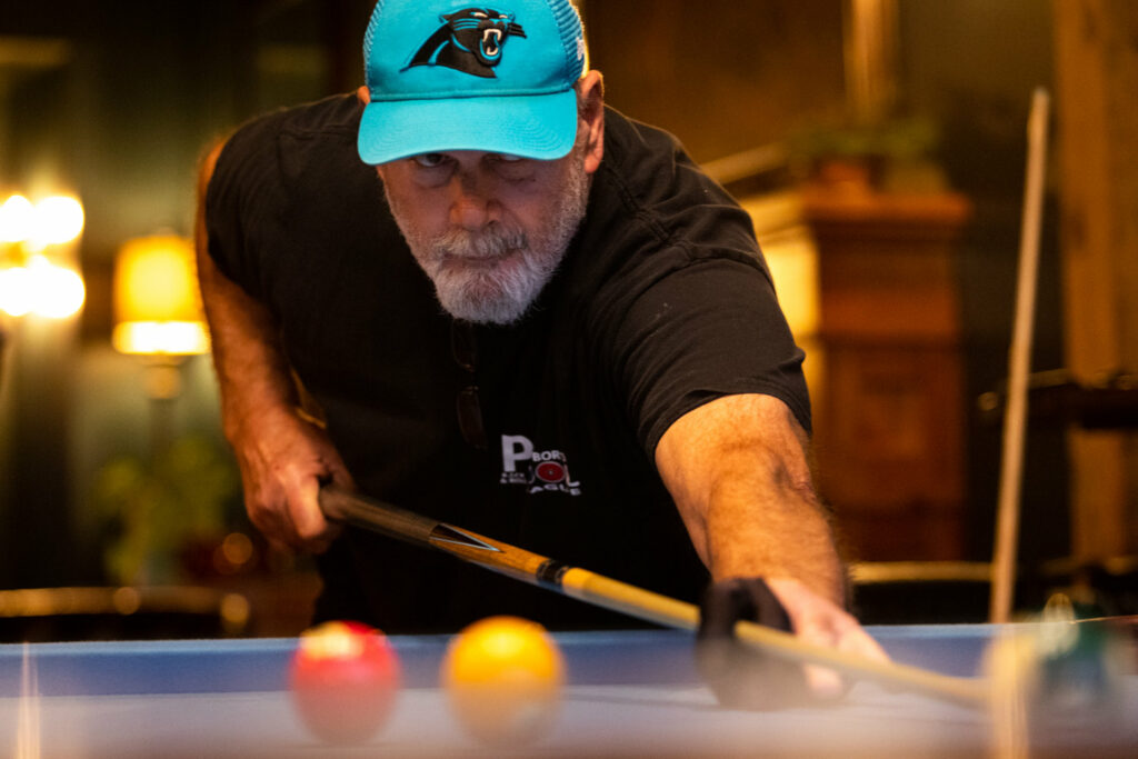 Squaring up the white cue ball on the pool table at the Sycamore at Chatham Mills, Jay Niver hunches over and — eye level with the ball — pulls back his brown wooden pool cue. Then, in rapid succession he moves it back and forth toward the cue ball, as if winding up. Once, twice, three times, then four: his target makes loud contact with the red 3 ball, sinking it into the corner pocket.