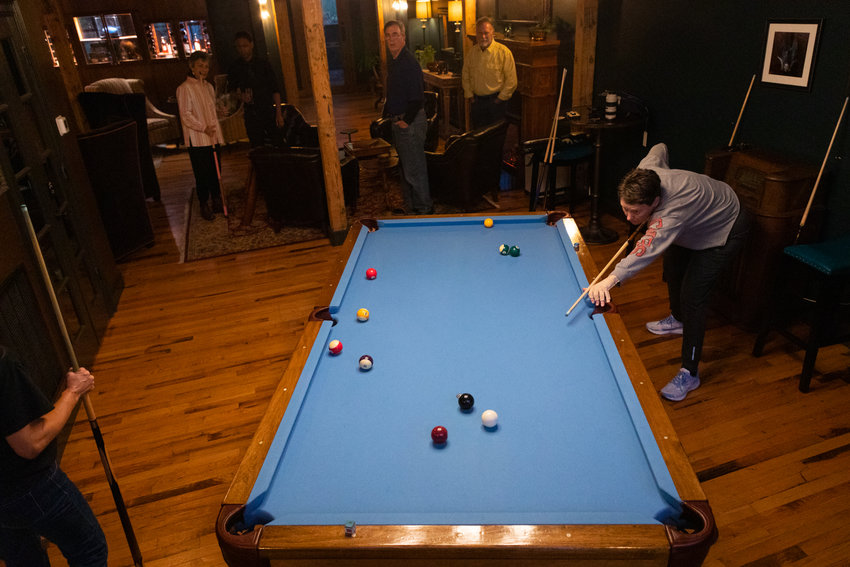 Jay Niver, founder of the Pittsboro Pool League, shoots the ball during a match at The Sycamore at Chatham Mills on Wednesday, Nov. 2, 2022. Niver won the match.
