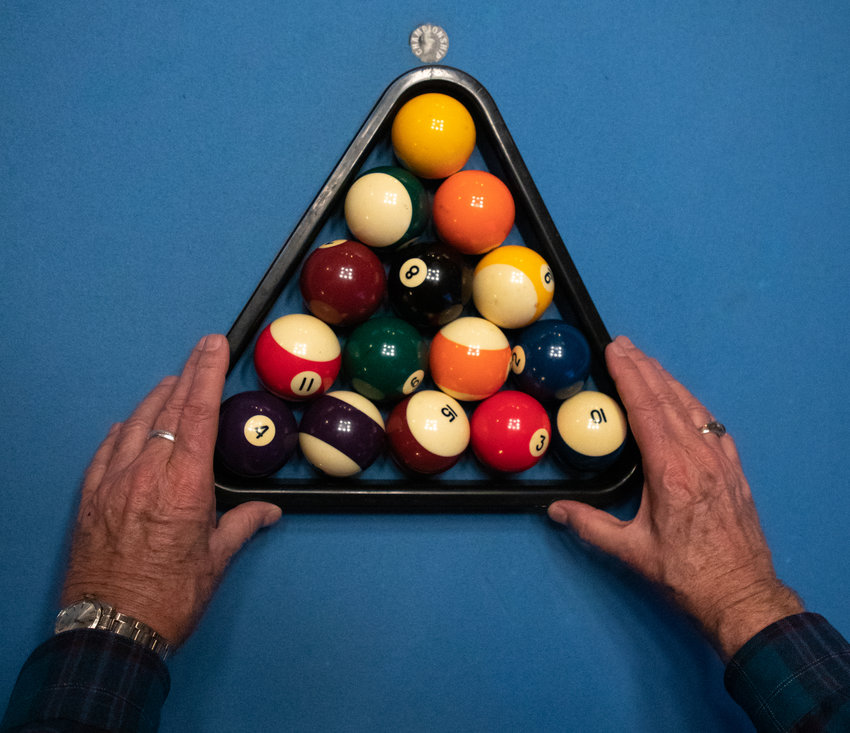 Jimmie Vaughn, member of the Pittsboro Pool League, arranges the balls in preparation for a pool match against Antonio Sloan at The Sycamore at Chatham Mills on Wednesday, Nov. 2, 2022.