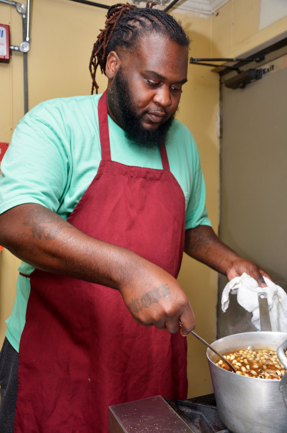The ‘Soul Roll’ is a specialty of the house. Last Thursday, Andre Chaney, owner of the new A& I Chicken Shack, stirs the black-eyed peas that will be added to collards and potatoes to make the tasty dish. (photo by David Bradley)