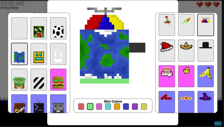 A pixelated globe wearing a birthday cake hat has to escape a pumpkin and make it to the green flag.