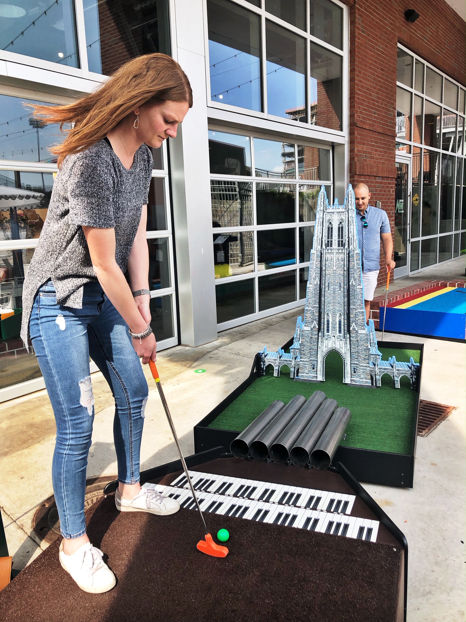 Bull City Mini: Play seven holes of mini golf – and sip on a beverage while you do it – just a few steps away from Durham Bulls Athletic Park. The owners asked the community to submit Durham-based designs, and the community delivered in a charming way. Durham landmarks like the Eno River, Duke Chapel and the infamous Can Opener Bridge are represented on this fun course.
