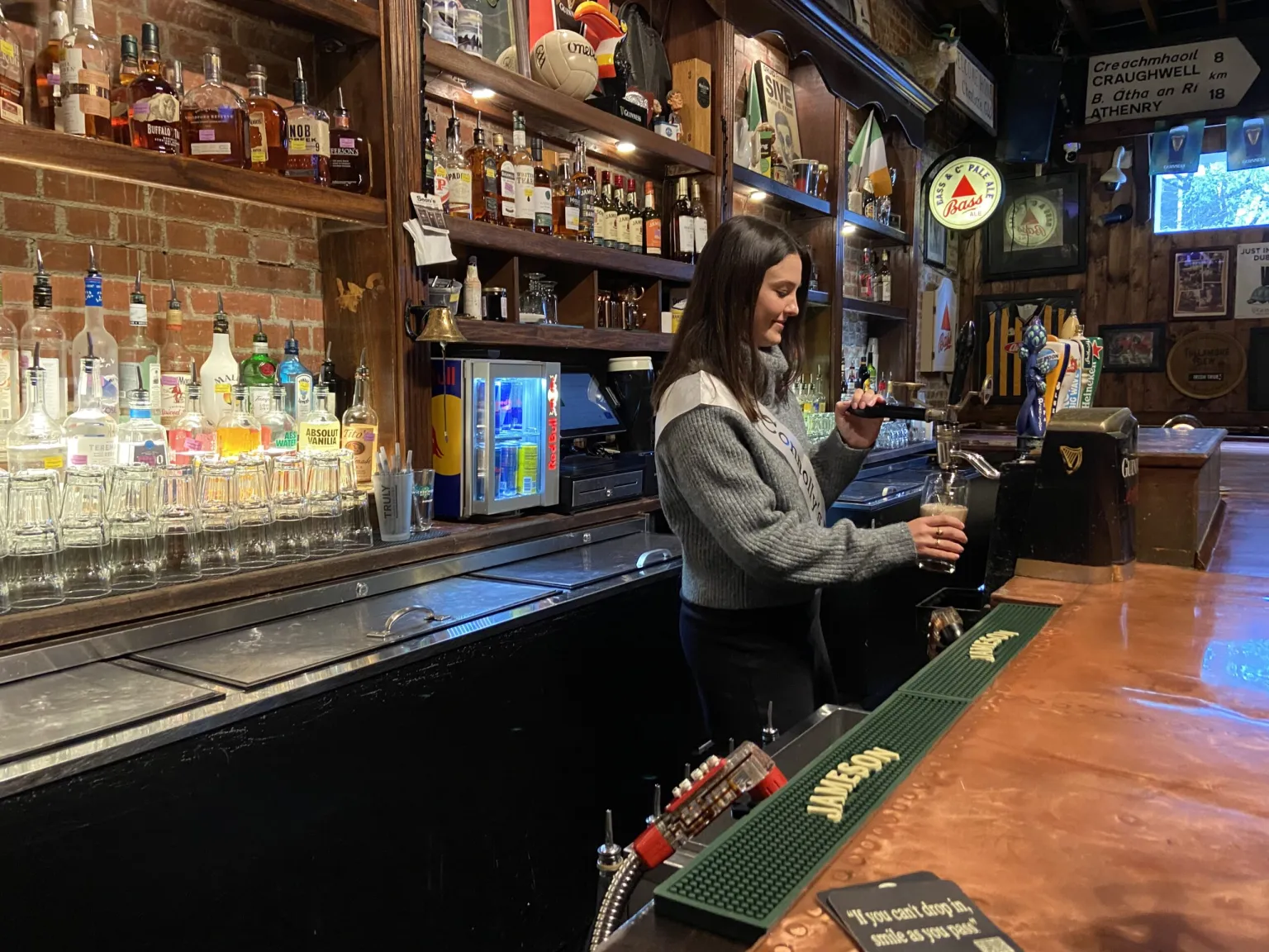 Kathryn Wright, now crowned the 2024 North Carolina Rose of Tralee, pours a pint of Guinness behind the bar at Connolly’s on Fifth in Charlotte. The Irish pub was her sponsor for this year’s Rose of Tralee event, and Wright wore the bar’s name on her sash during the course of the day. | Photo by Hannah Rosenberger
