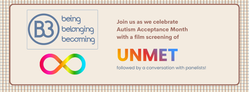 This weekend B3 will be at the Chapel Hill Public Library for the annual screening of a film, Unmet, that centers the neurodivergent experience. The film screening will be followed by a panel conversation with Autistic adults. They will reflect on their personal experiences, highlighting systemic challenges, resources, and ways to be an ally to the disability and neurodivergent community. For more information, click here.