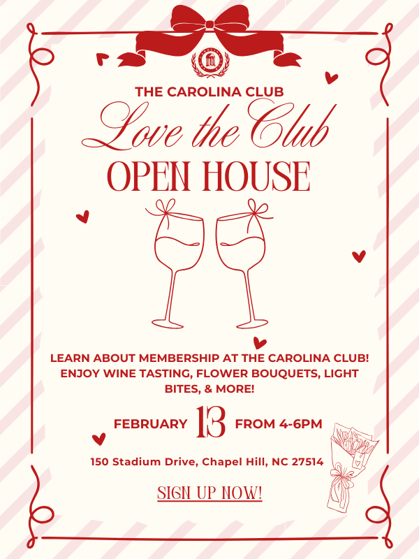 The Carolina Club is having an open house this Friday. Guests are invited to tour the venue, enjoy fun giveaways, take home a complimentary bouquet of flowers, and of course, discover the benefits of being a member of The Carolina Club. For more information, click here.