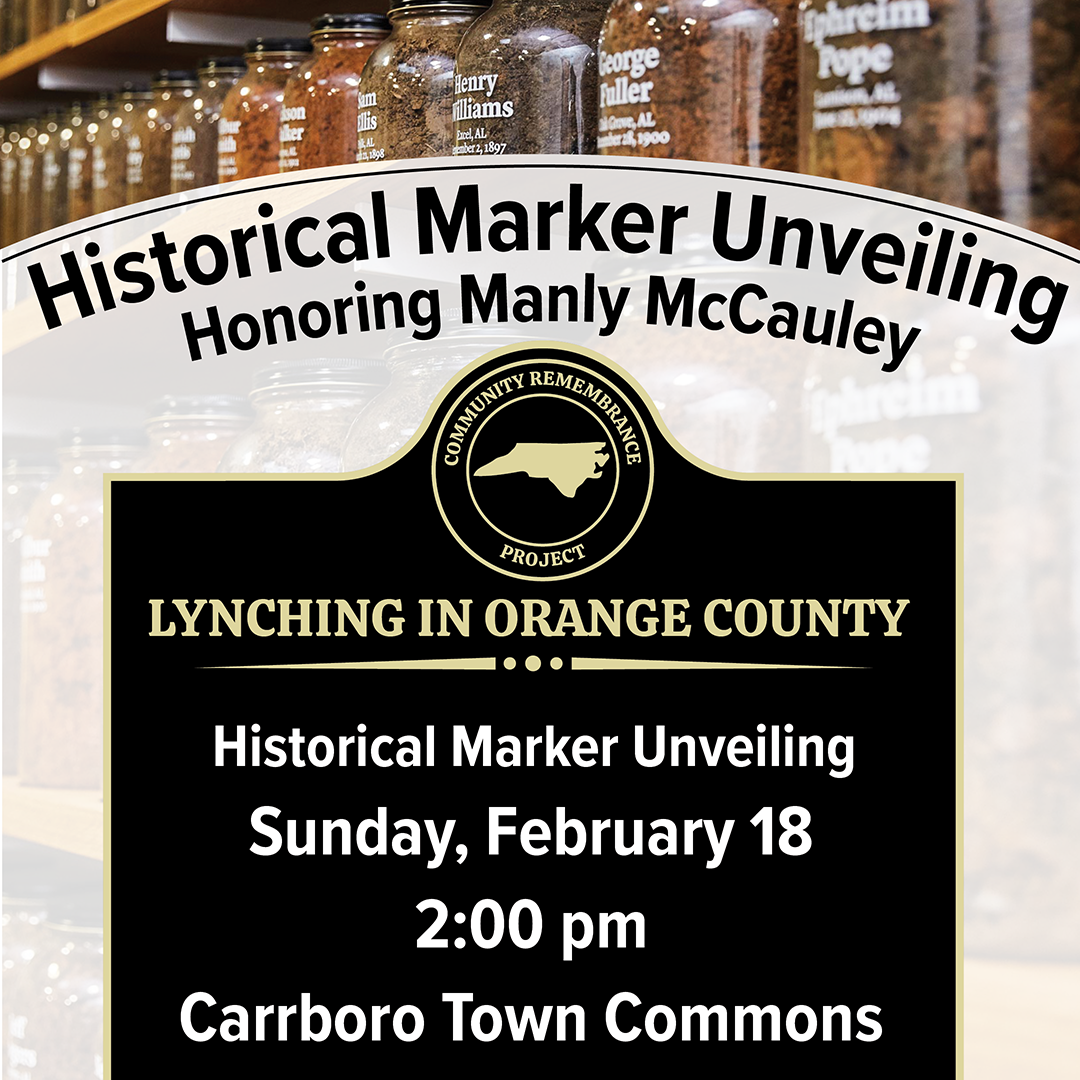 This weekend at the Carrboro Town Commons, the Orange County Remembrance Coalition, the Town of Carrboro, and the Equal Justice Initiative will be joining together to commemorate the life and terror murder of Manly McCauley. The historic marker will be unveiled tomorrow with special remarks, spoken word, and a music program with members of McCauley’s family, invited guests, and community leaders. For more information, click here.