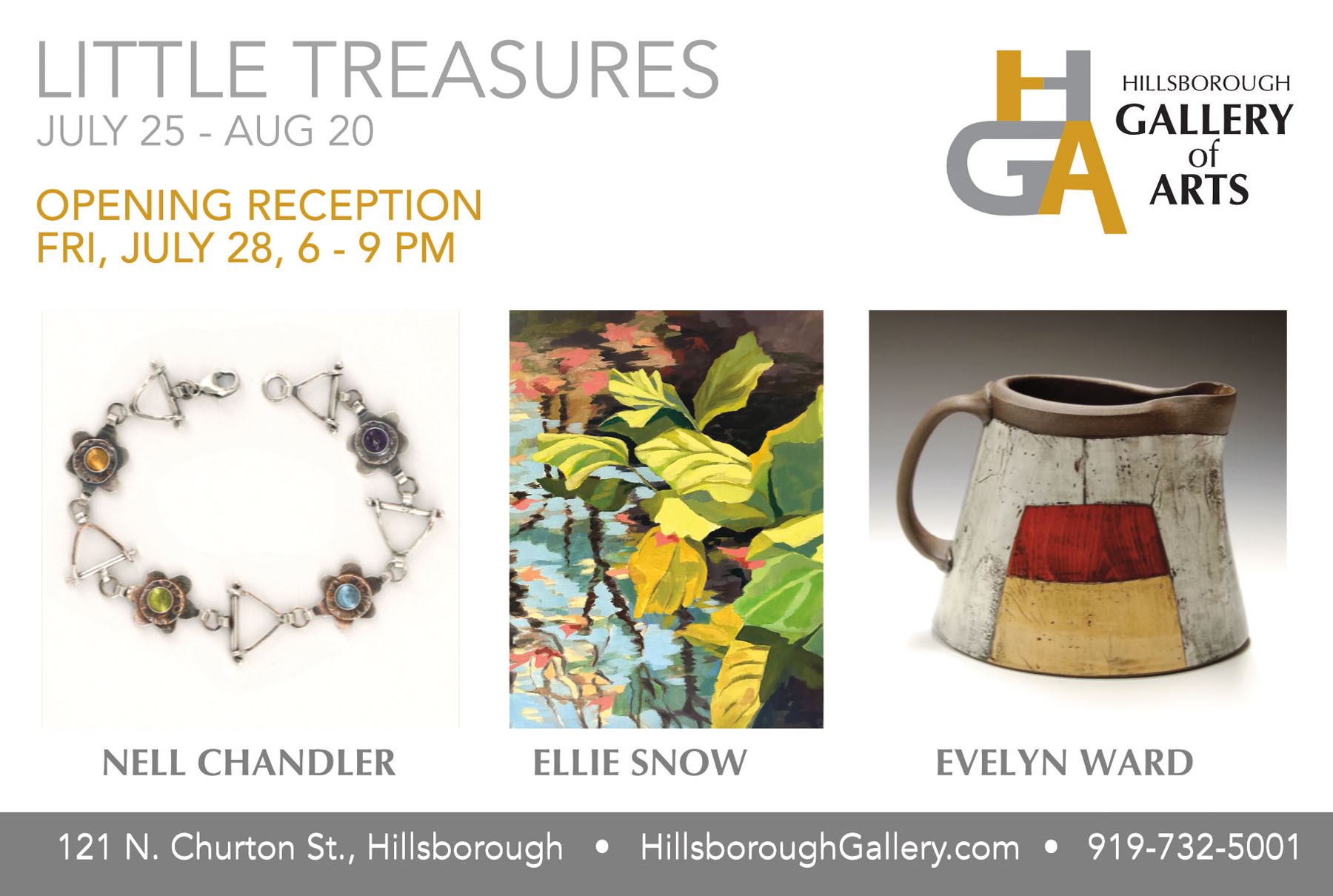 Hillsborough Gallery of Arts is holding the opening reception for their newest showing Little Treasures. The exhibition features mixed metal jewelry from Nell Chandler, mixed media and acrylic paintings by Ellie Snow, and pottery by Evelyn Ward. The art will be available for viewing until August 20th, but the opening reception is this Friday. For more information on the exhibition or the opening ceremony, click here.