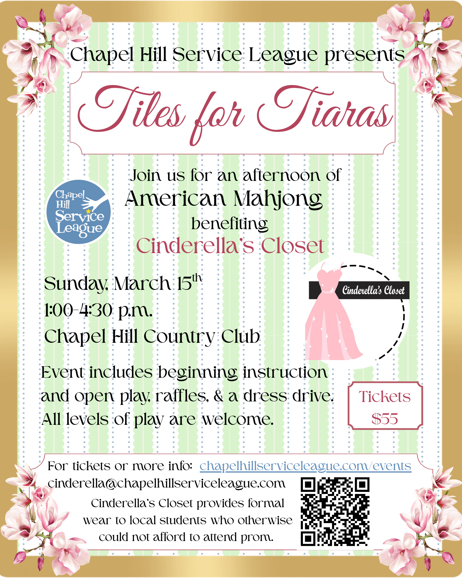 Play mahjong this weekend at the Chapel Hill Country Club to support Cinderella’s Closet. All experience levels are welcome to play. There will be raffle prizes, food and drink, and more. For more information, click here.