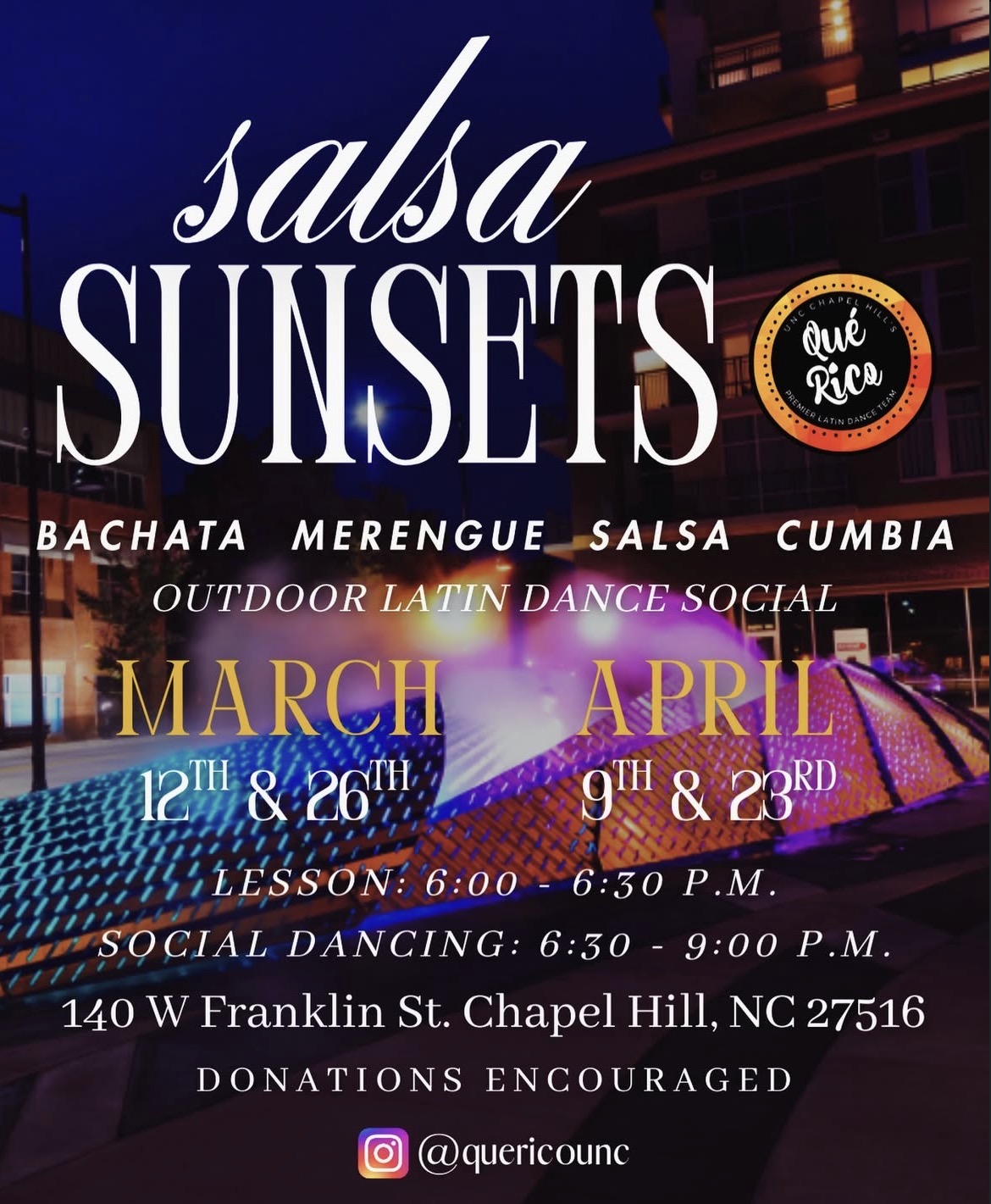 UNC’s Que Rico club will be holding Salsa Sunsets. Come out and learn new Latin dance styles then watch the sunset over Franklin Street. For more information, click here.
