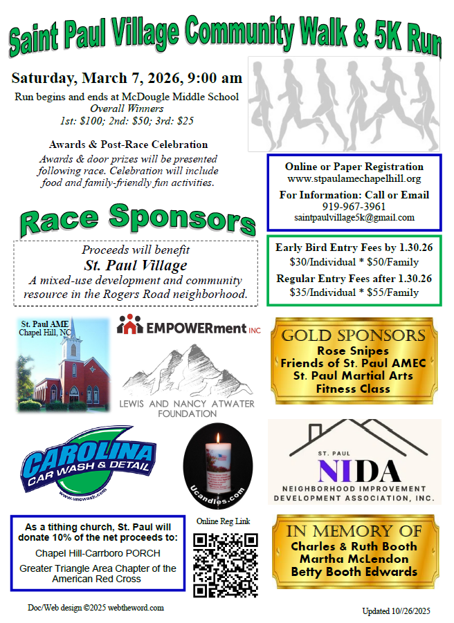 The 14th annual St Paul Village Community 5K walk/run is at McDougle this weekend. There are 14 different age groups so all are welcome to participate. For more information, click here.