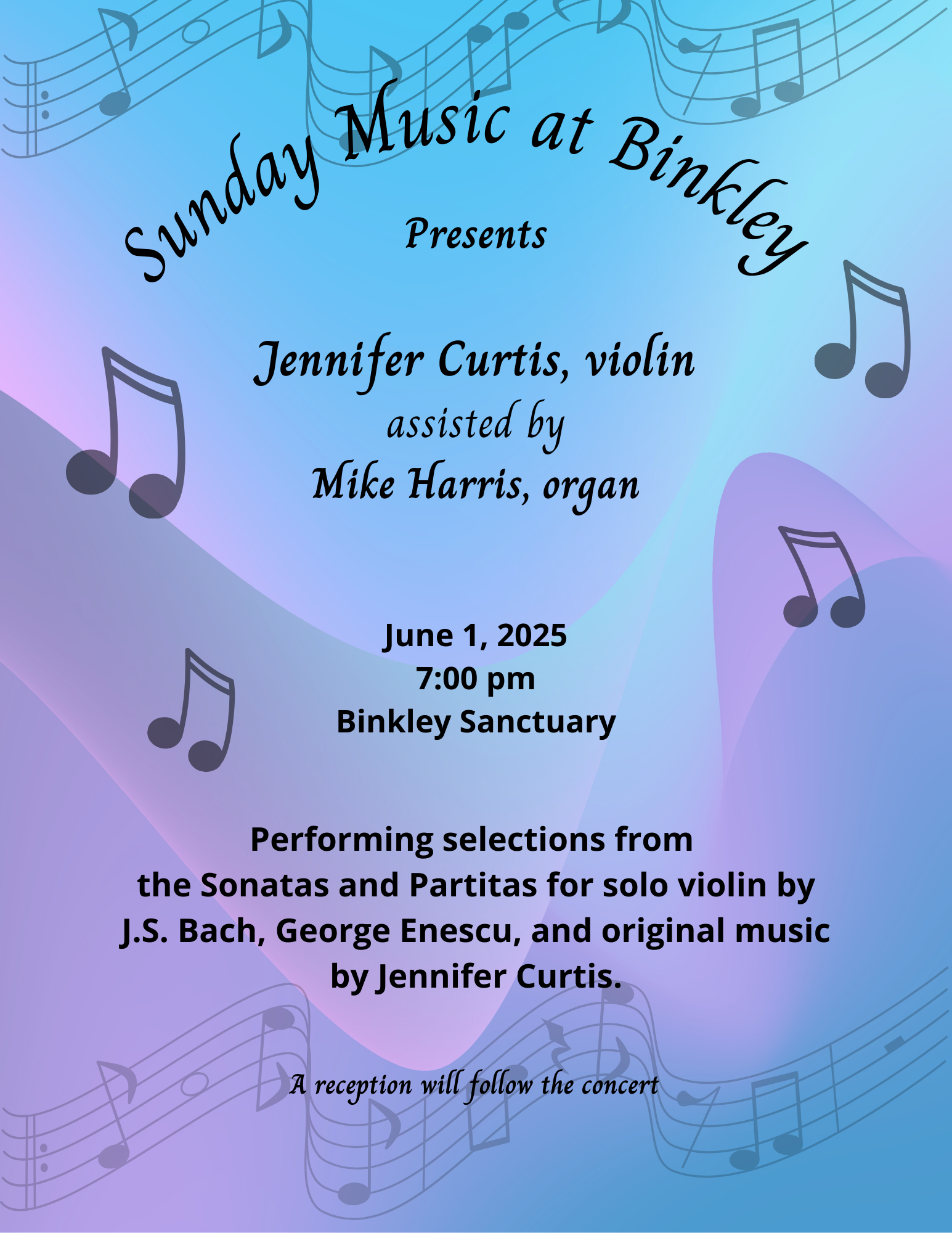 Enjoy some live music this Sunday at Binkley Baptist. Violinist Jennifer Curtis will be performing a recital of works from Bach to original compositions, accompanied by Binkley organist Mike Harris. Click here for more information.