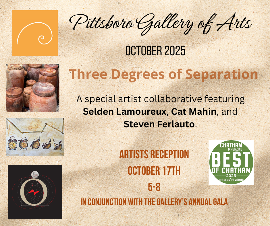This weekend at the Pittsboro Gallery of Arts they will be having another exhibition, Three Degrees of Separation with art from Selden Lamoureux, Cat Mahin, and Steven Ferlauto. There will be pottery jars, surreal clock paintings, and scrolls of sacred geometry. For more information, click here.