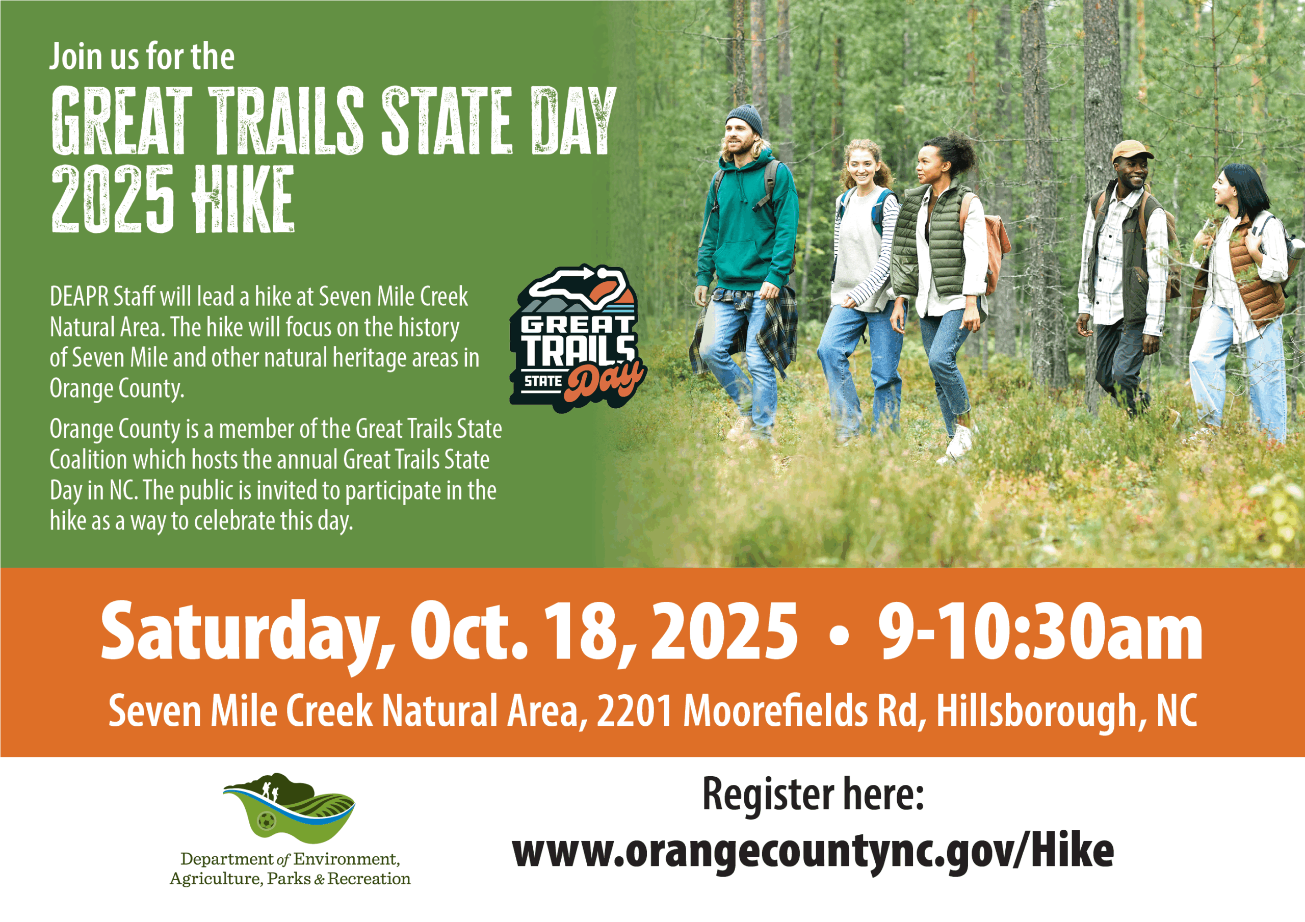 This weekend, the Orange County Department of Environment, Agriculture, Parks and Recreation will be holding a great trails state day hike. The hike will be along the Seven Mile Creek Natural Area and it will focus on the history of Seven Mile and other natural heritage areas in Orange County. For more information, click here.