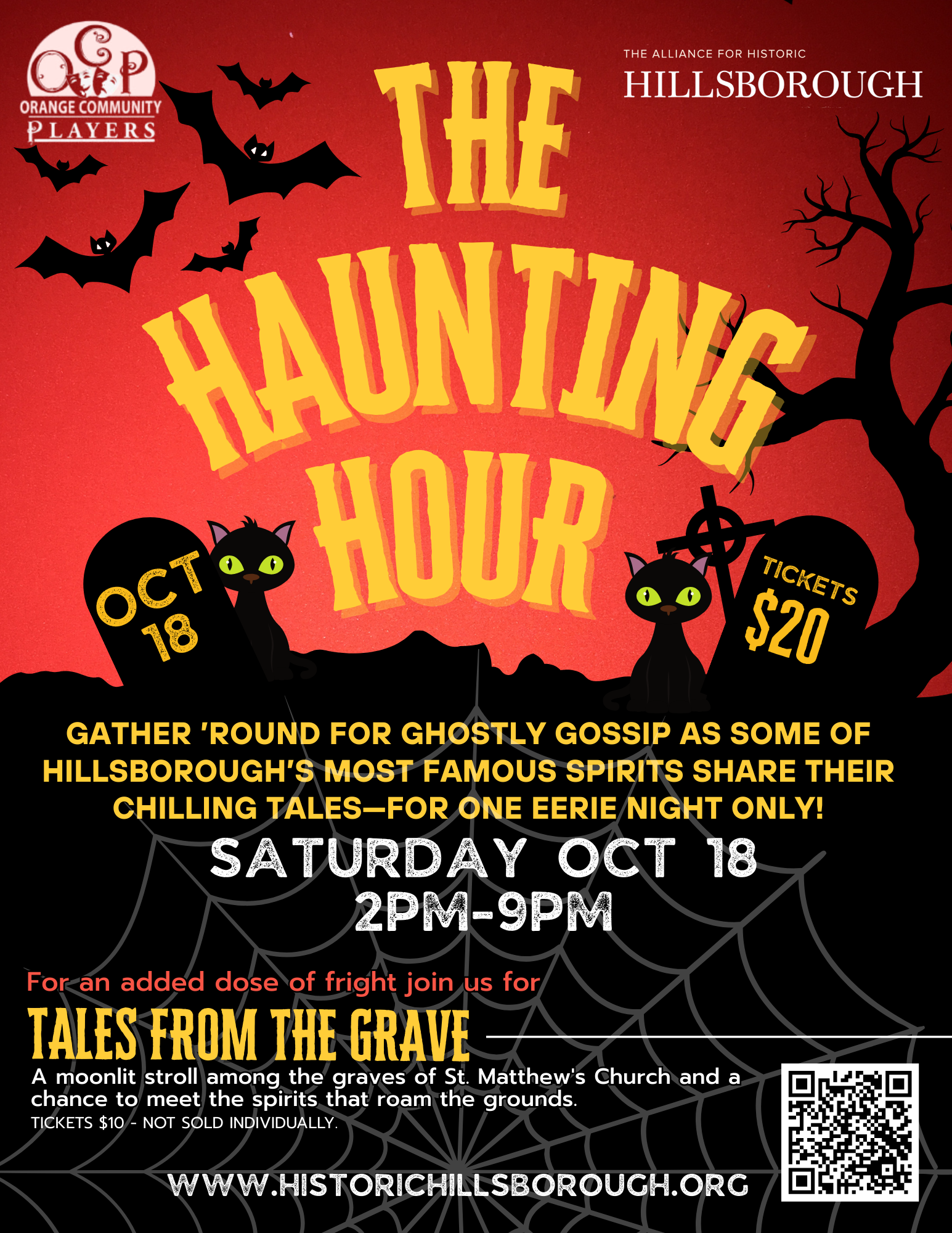 This weekend, the Hillsborough Visitors Center will be having The Haunting Hour. It will be an immersive evening of storytelling where ghostly tales and eerie legends unfold around you with a performance at the historic Hughes Academy. There will also be a moonlit mini walking tour through St. Matthew’s Episcopal Church graveyard. Click here for more information.