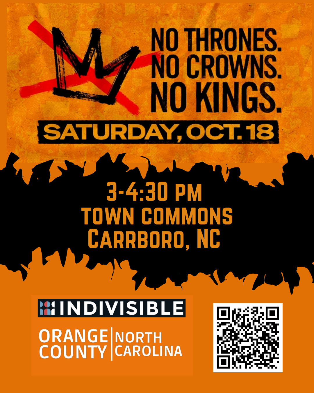 This Saturday, the No Kings 2 rally will be held at the Carrboro Town Commons. This public event is part of a national movement demanding accountability, free and fair elections, and a government that serves the people- not a king.The rally will gather activists, community members, and local leaders to stand united against authoritarianism and the erosion of democratic norms. For more information, click here.
