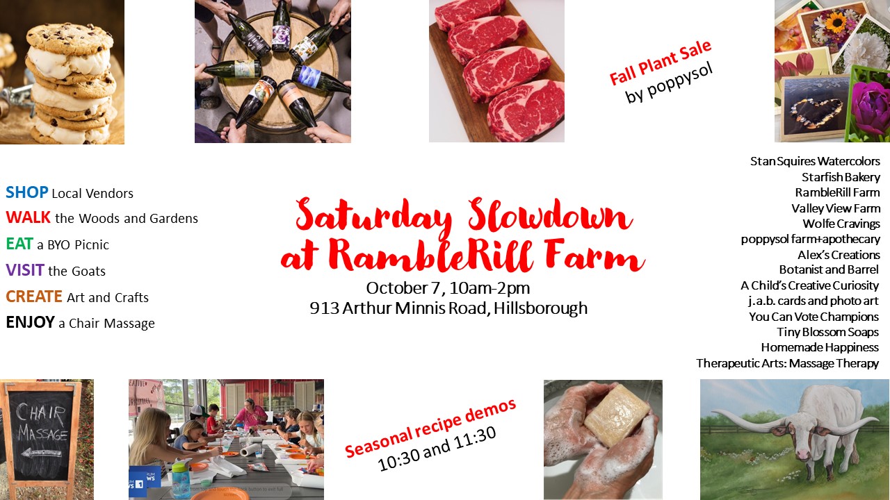 Slow down this weekend at RambleRill Farm for another Saturday Slowdown. Pack a picnic and enjoy it in the outdoors, take a walk around the grounds and visit the chickens and goats, shop local vendors, and enjoy so much more fun at the farm. To check out what else you can enjoy at RambleRill farm, click here.