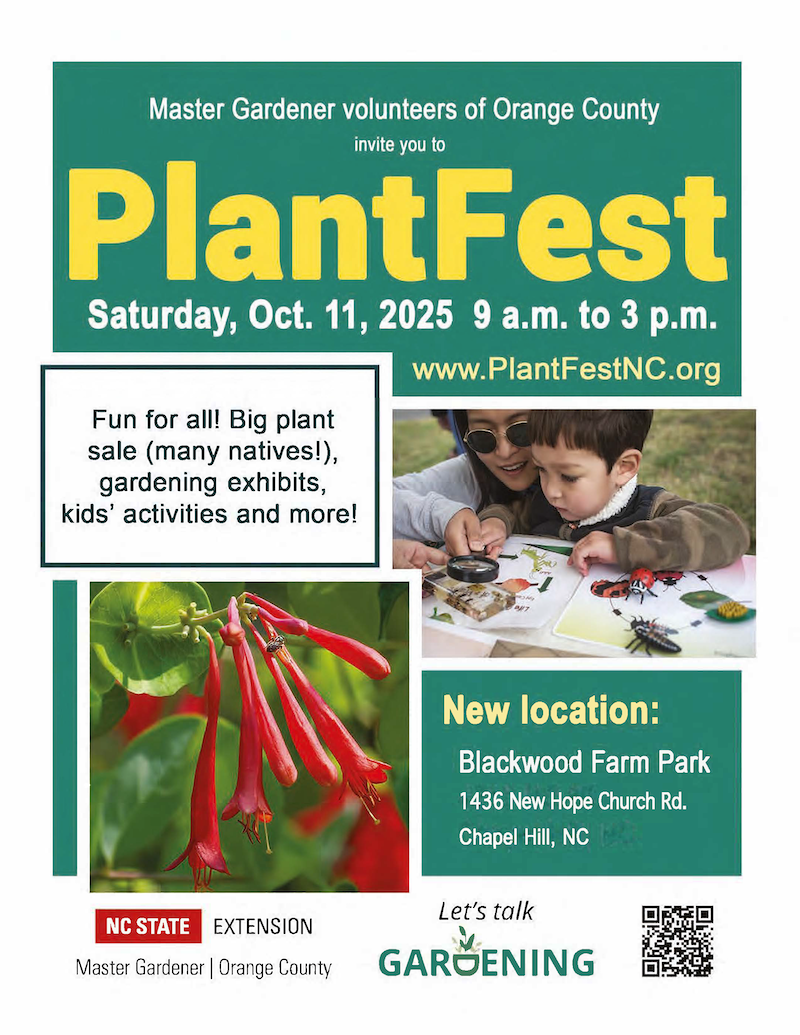 The Master Gardener volunteers of Orange County will hold PlantFest on Saturday at Blackwood Farm Park (use the entrance near 1440 New Hope Church Rd.). Big plant sale and garden festival, with kids’ activities, gardening exhibits, a nature-themed art sale, free seeds, tool sharpening, food, music and more! Click here to learn more.