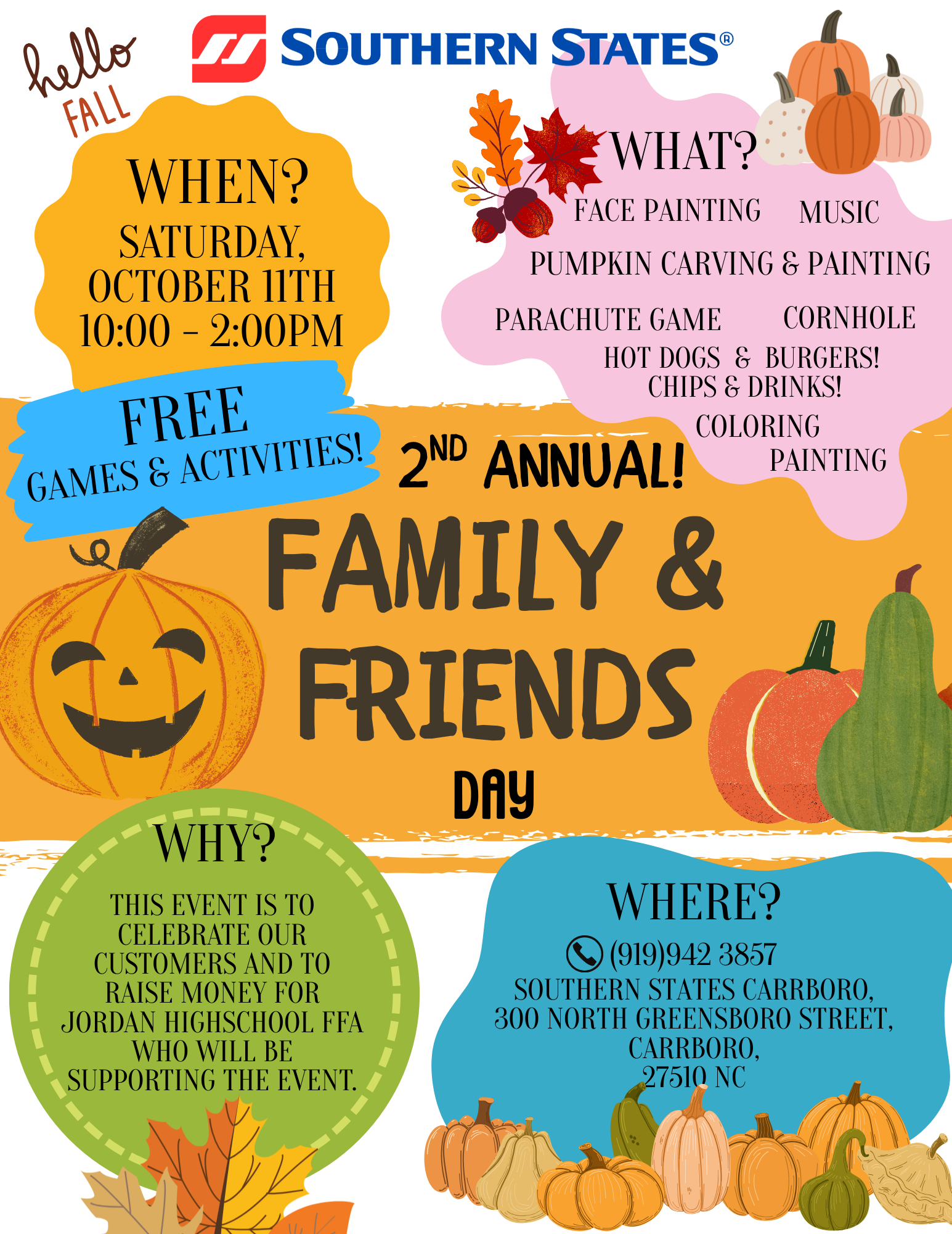 Come out to Southern States for their 2nd Annual Family and Friends Day. There will be plenty of fun games and activities for the whole family, face painting, pumpkin carving, and more! For more information, click here.