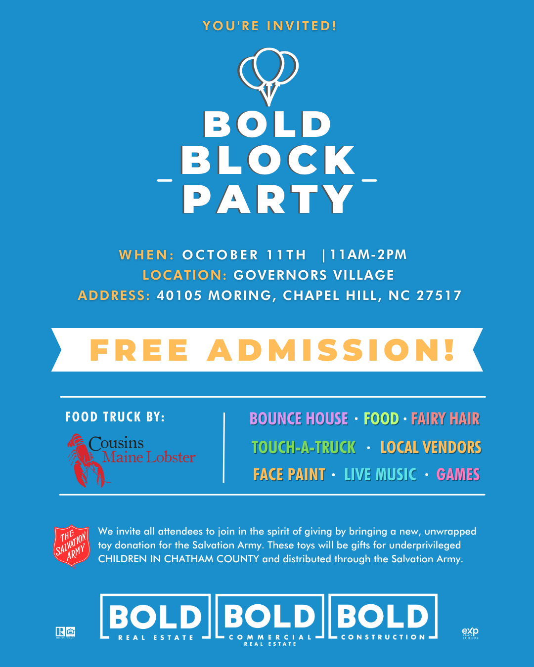 This weekend, join BOLD for their block party. There will be food, games, touch-a-truck, a bounce house, and more! In the spirit of giving, please bring an unwrapped gift to support the Salvation Army’s toy drive. For more information, click here.