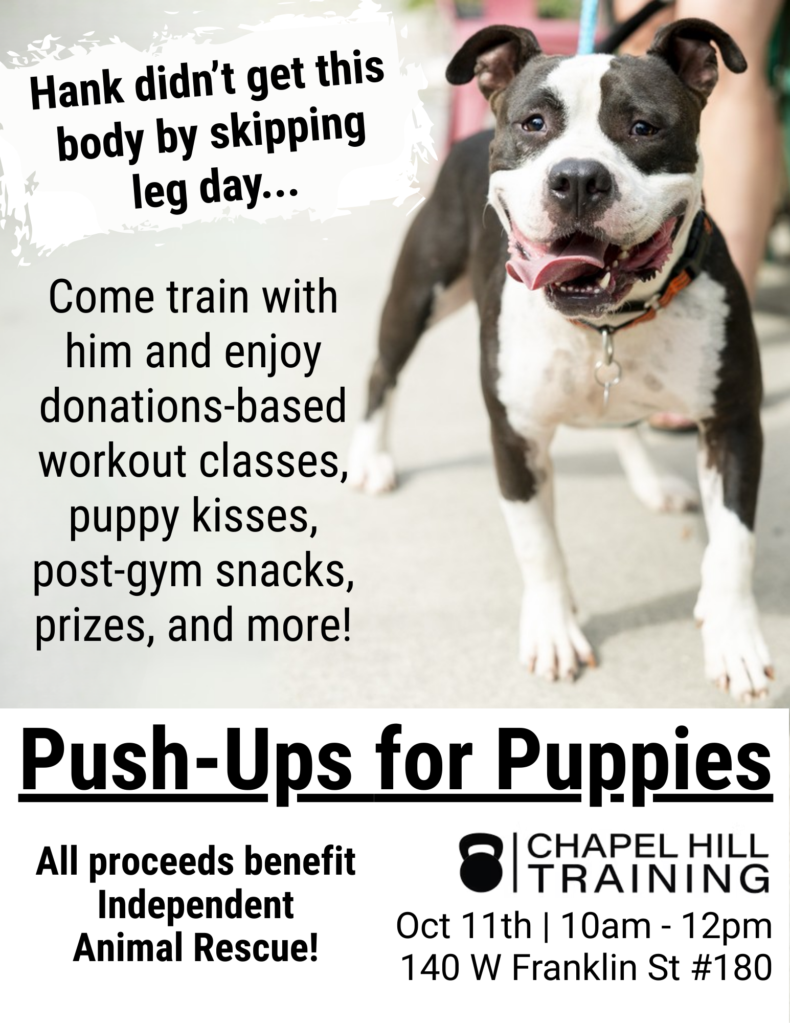 Independent Animal Rescue is having a fundraiser with Chapel Hill Training. Come out and workout in an instructor led class. Between sets, meet adoptable dogs and puppies from Independent Animal Rescue, grab free snacks, and enter to win prizes. For more information, click here.