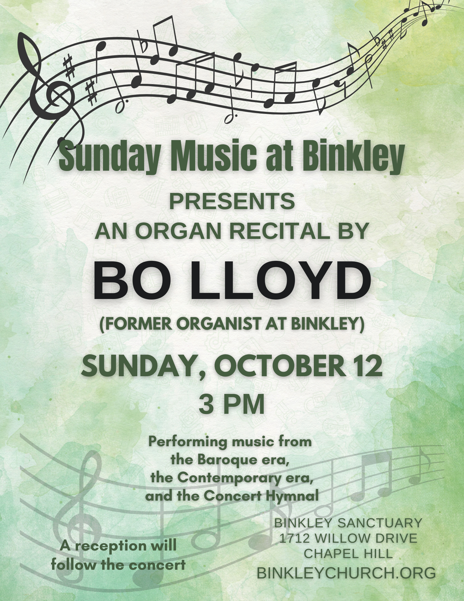 Enjoy some more live music this weekend at Binkley Baptist Church. Binkley’s former organist Bo Lloyd will be performing an organ concert with music from the Baroque era, the contemporary era, and the concert hymnal. Click here for more information.