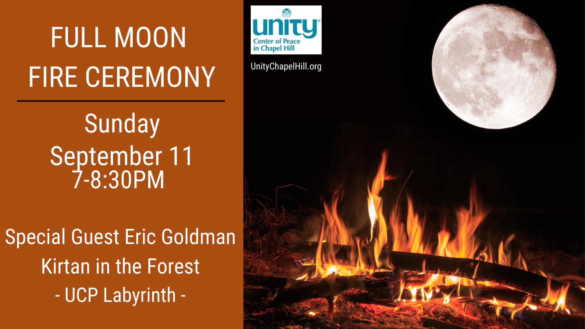 Join the Unity Center of Peace for their Full Moon Fire Ceremony. The full moon of September is the Harvest Moon. The event will begin on the front porch of UCP for a short word from Rev. Chris Geith and will follow with a walk in silence to UCP’s Kirtan spot in the forest. Bring a blanket, a chair, or a water bottle, whatever you need for your comfort. For more information about what this event will feature, click here.
