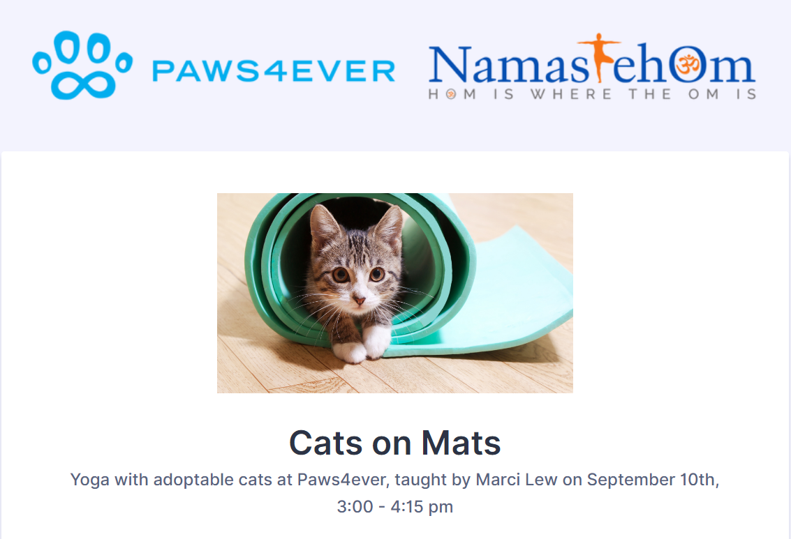 Come out to Paws4ever on Saturday at 3:00 for a yoga class with cats. You’ll get a nice workout while hanging out with some adorable cats up for adoption! Only 25 spots are available so be sure to reserve your spot today! For more information, click here.
