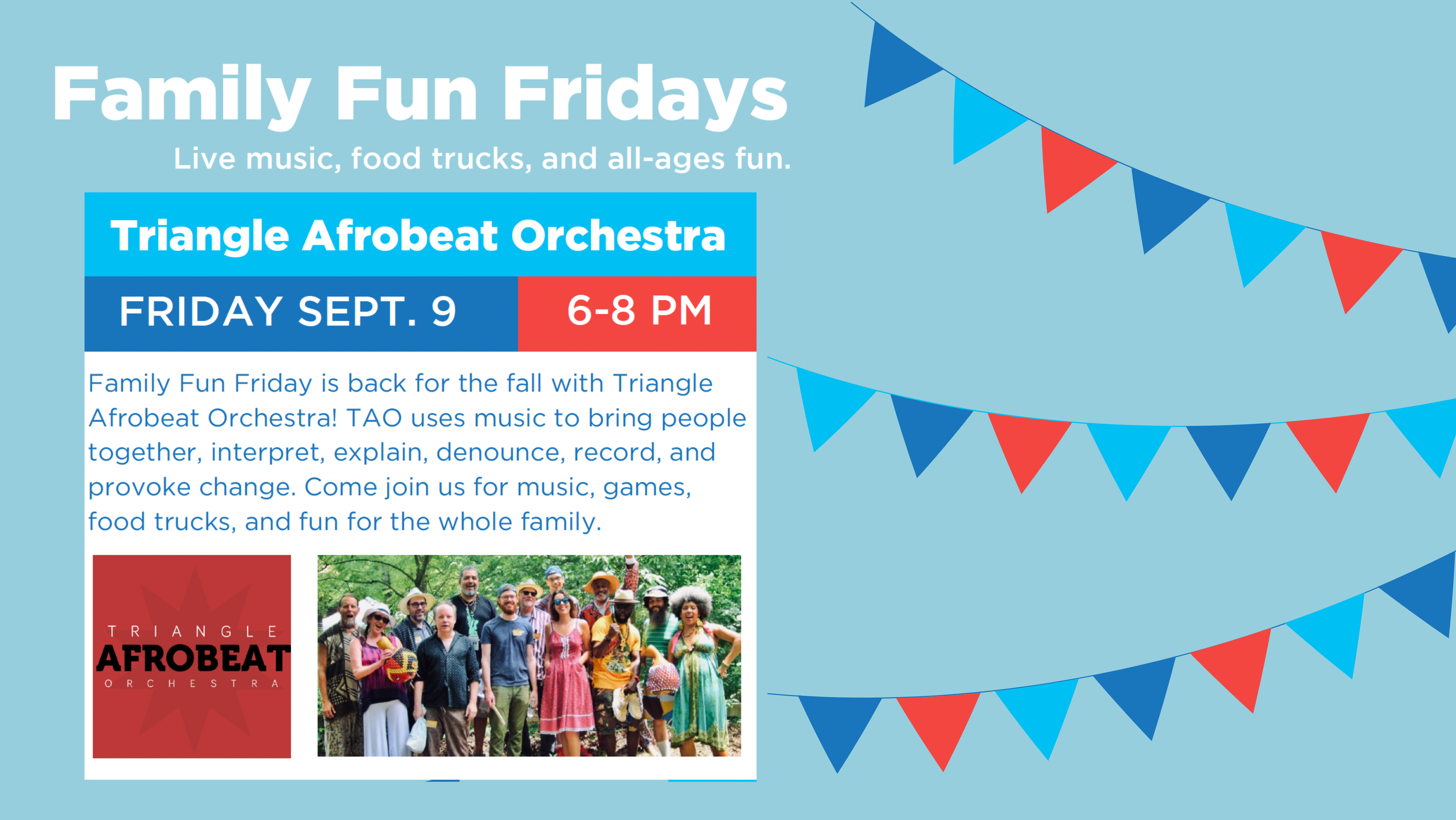 Come out to Chapel Hill Public Library for the return of Family Fun Fridays. It will be a fun night of music, games, and food. Triangle Afrobeat Orchestra will be playing their fun, danceable music for everyone. Bring your own food or get food from the food trucks that will be on hand and enjoy a picnic. Your kids will love the yard games, chalk, bubbles, and more that will be available to play with. For more information, click here!