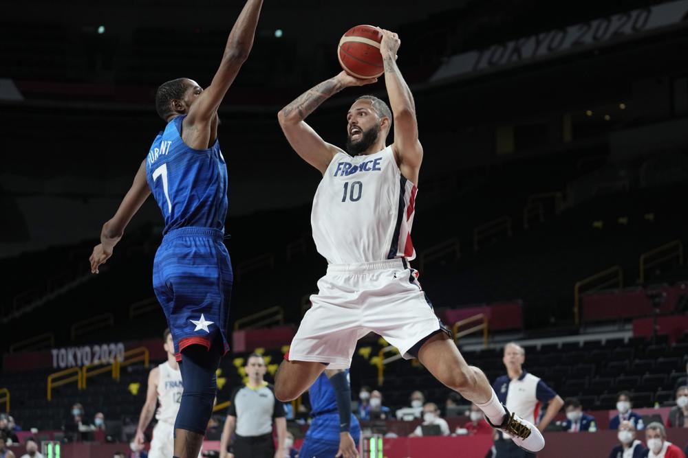 France’s Evan Fournier (10) shoots over United States’ forward Kevin Durant (7) during a men’s basketball preliminary round game at the 2020 Summer Olympics, Sunday, July 25, 2021, in Saitama, Japan. (AP Photo/Eric Gay)