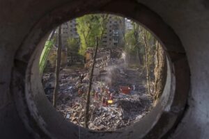kyiv ukraine 042425 russian strike destroyed neighborhood cleanup AP PHOTO